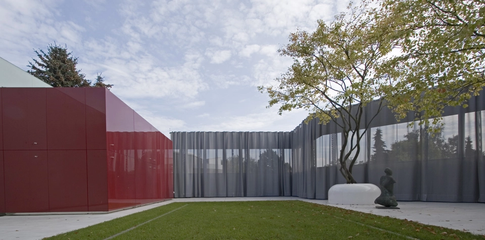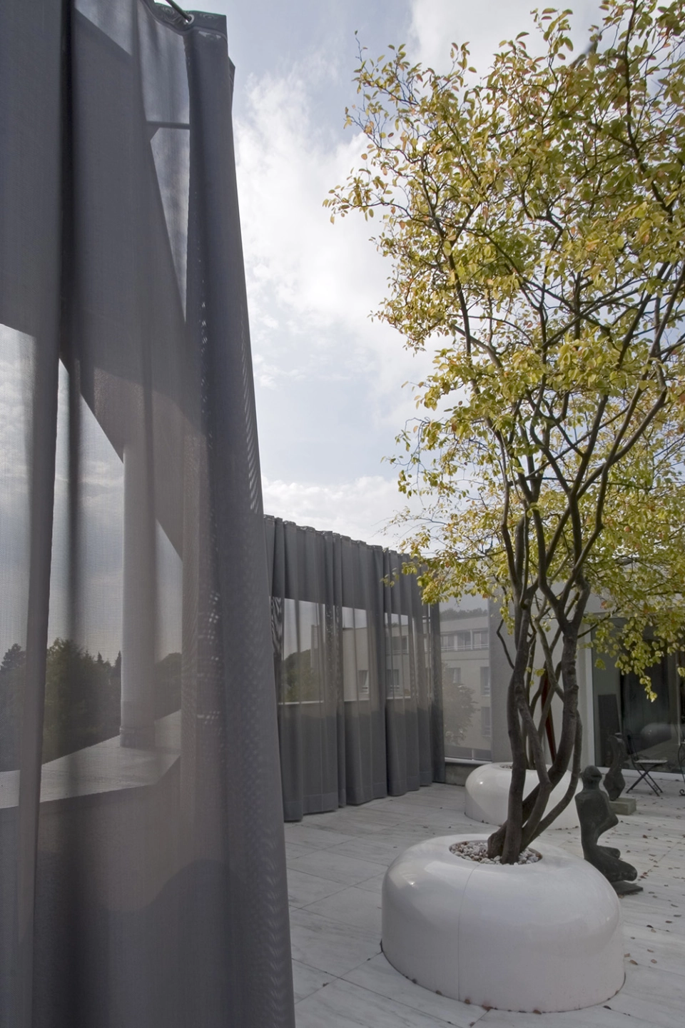 Rasen bildet den Teppich, bemustert durch einen eingelegten Edelstahlrahmen. Die sich wiegenden grauen Vorhänge sind aus einem kräftig gewebten, wasserverträglichen Kunststoff aus der Schwimmbeckenindustrie, eine Mauer wird nun durch eine leuchtend rote Kunststoffschalle kaschiert.