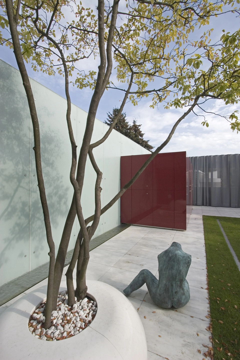 Der weiße Marmor des Bodens in der Wohnung setzt sich draußen fort, um den Garten als weiteres Zimmer zu begreifen. Felsenbirnen wachsen aus reinweißen Kugelsockeln. Sie bringen ein grafisches Element in den Garten, wie Bilder an der Wand in einem richtigen Wohnzimmer.